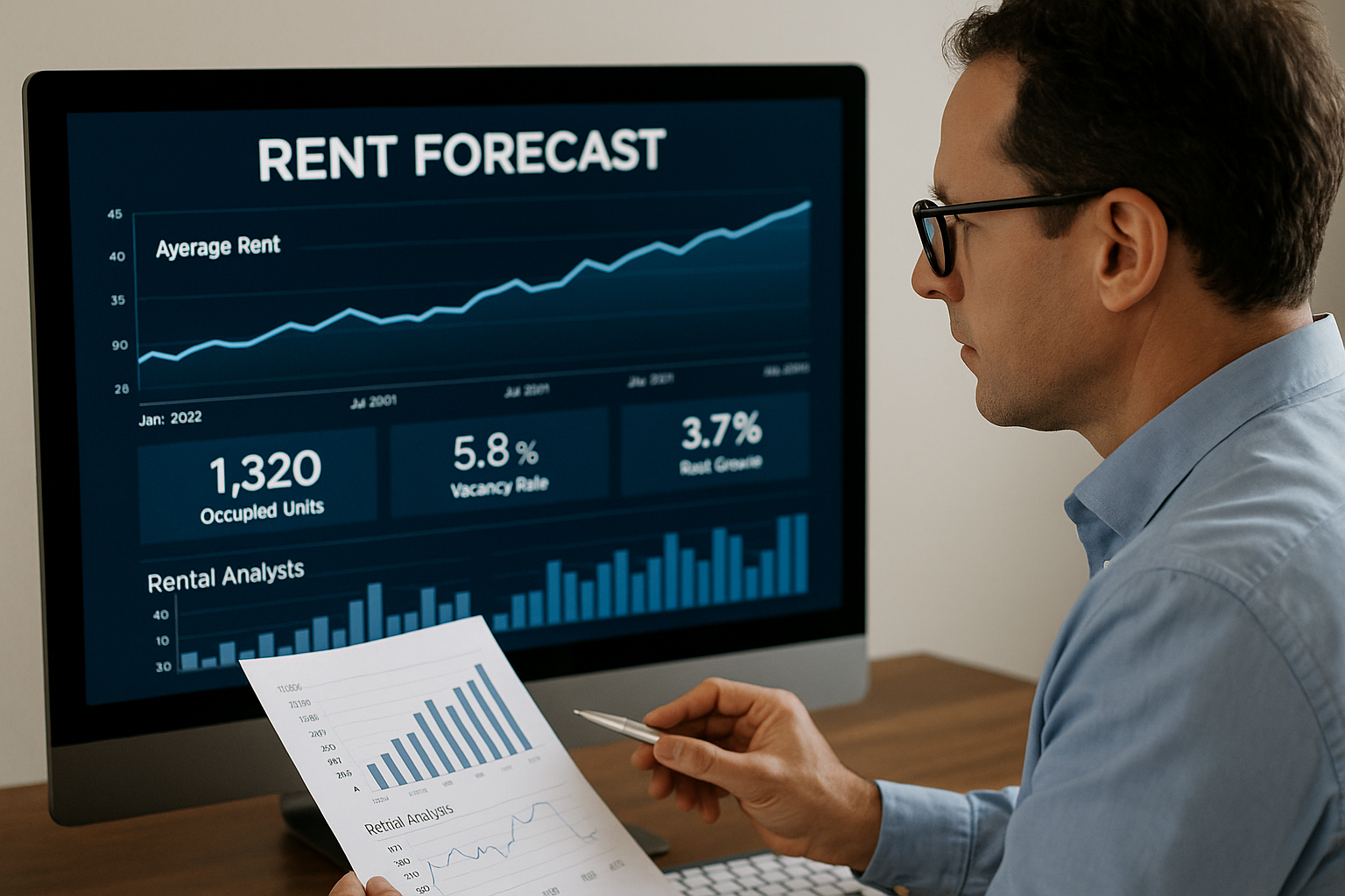 “Build-to-rent investor analyzes rent forecast dashboard.”